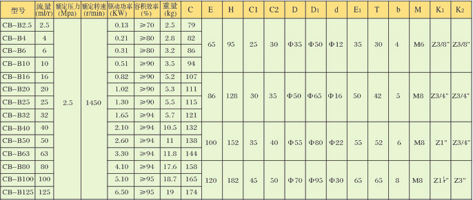 一、用途和特征 CB-B型齿轮泵是液压系统中的动力元件。该泵采用高精度齿轮,高强度铸铁壳体等结构。通过相互啮合的齿轮将电机所输的机械能转变为液压能的能量转换装置。在液压系统中,以提供一定的液压能源。该泵结构简单、工作可靠、维护方便、对冲击负荷的适应性好,在机床液压系统中被广泛采用,并可用于其它机械的液压系统中。 二、型号说明 ①系列号:CB-B 定量齿轮泵 ③排量:ml/r ②公称压力:2.5Mpa ④旋向:顺时针旋转省略,逆时针旋转标注“X” 三、外形图